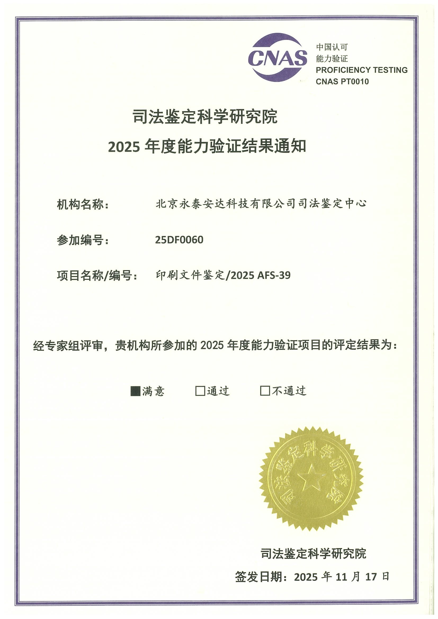 • 2025年能力验证(文书鉴定-印刷文件鉴定)